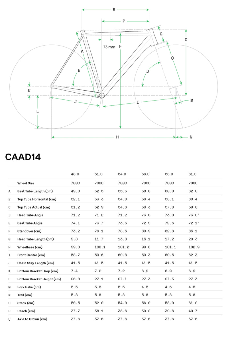 A lineage of fast aluminum shaped over decades—smooth welds, clean geometry, road-true handling. CAAD14 is built for the pure feel of road riding: the pull, the side-glance, the shoulder-to-shoulder sprint, the arms-up finish.