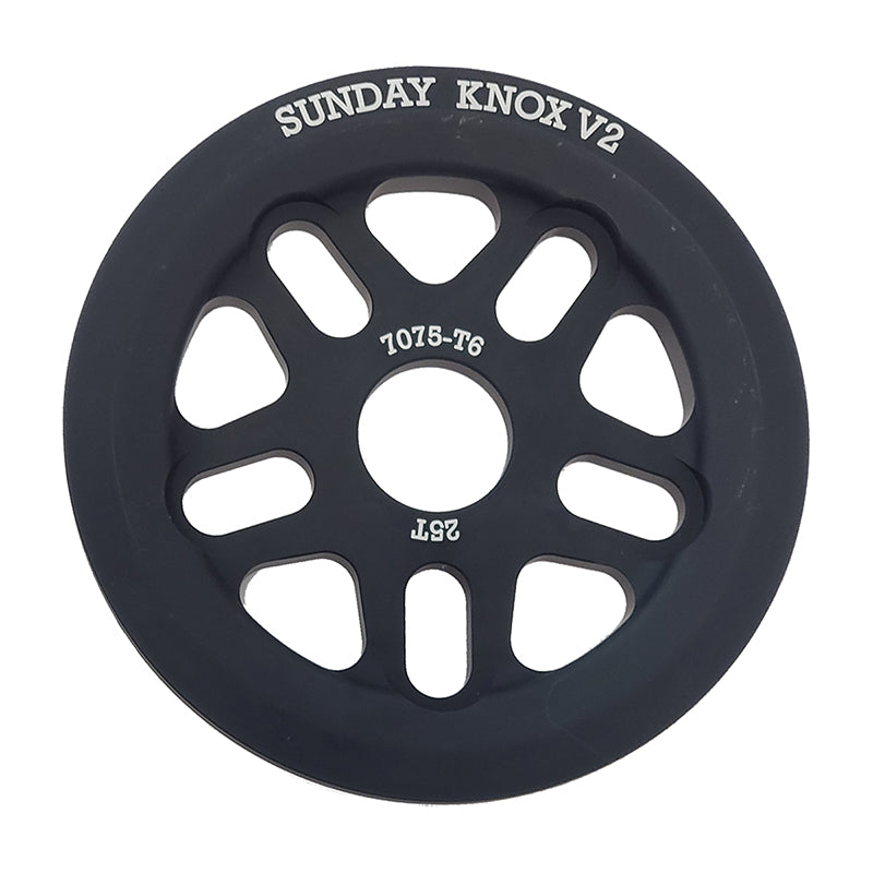 Sunday Knox V2 Sprocket - 25t Black. The Sunday Knox V2 guard sprocket made of 7075-T6 aluminum. Featuring refined machining geometry for a sleeker look and designed to work with and protect all chains from unwanted impact.Full guard on one side of the sprocket with 5 rotatable sprocket bolt hole positions