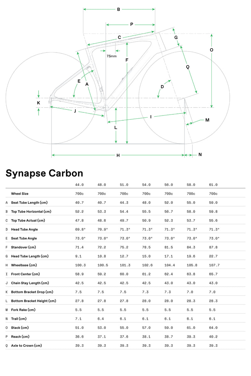 • Frame: Synapse Hi-MOD Carbon, Proportional Response construction, SmartSense Gen 2.0 equipped, 12x142 thru-axle, UDH, BSA threaded BB, flat mount disc, internal routing
