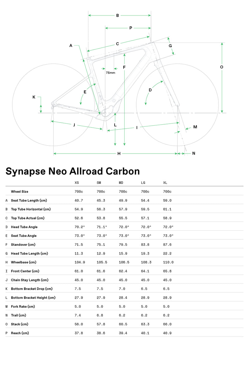 • Frame: Synapse Neo Carbon, internal battery, 148mm dropout spacing, 12mm thru-axle, SAVE, flat mount disc.